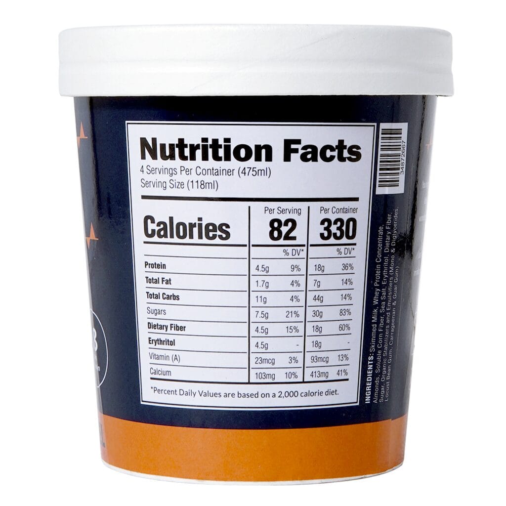 Skimmed Milk, Whey Protein Concentrate, Almonds, Soluble Corn Fiber, Sea Salt, Erythritol, Dietary Fiber, Sugar, Organic Stabilizers and Emulsifiers (Mono & Diglycerides, Locust Bean Gum, Carrageenan & Guar Gum)